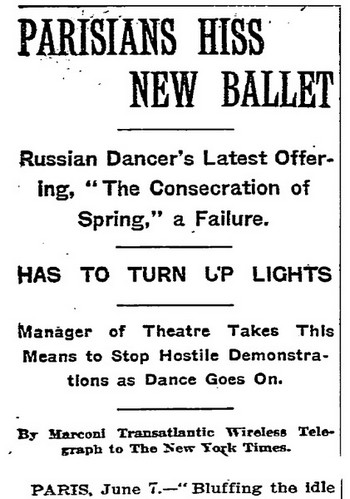 Hučení, pískání, dupání, tu a tam facky – taková byla před 100 lety, 29. května 1913, premiéra baletu Svěcení jara ruského skladatele Igora Stravinského v pařížském Théatre des Champs-Elysées. Skladba s podtitulem Obrazy z pohanského Ruska byla pro mnohé posluchače „nejfalešnější, jaká kdy byla napsaná“. Hudba tehdy jednatřicetiletého Stravinského hýřila disonancemi, ostrými zvuky a neobvyklými rytmy a znamenala zásadní přelom v dějinách hudby. Toto opus magnum hudby 20. století ovlivnilo mnoho skladatelů a bývá řazeno k přelomovému obrazu Avignonské slečny Pabla Picassa z roku 1907, který znamenal zrod kubismu. Premiéra Svěcení jara, která se konala jen 14 měsíců před vypuknutím první světové války, tak de facto otevřela dveře dalším zásadním hudebním přerodům 20. století.
