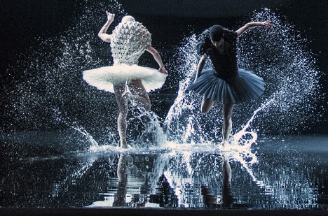 Za chvilku však pomyslná opona padá a novým střihem se dostáváme k tajemnému jezeru. Za tímto účelem zaplnil choreograf jeviště jako bazén pěti tisíci litry vody a vytvořil tak kuriózní prostor, ve kterém nelze provozovat klasickou techniku, ale spíš současný tanec (přitom ale voda na jevišti až tak úplná novinka není, víme, že třeba námořní bitvy byly inscenovány už v některých římských amfiteátrech a znalo je i barokní divadlo). Při tlumeném světle, kde se ve vodě zrcadlí jen temný horizont, vypadá prostředí chmurně a postapokalypticky, spíš jako zatopené katakomby než lesní jezírko. Sbor s černými pokrývkami hlavy připomínajícími koupací čepice se nesměle pohybuje jako mužstvo rozehrávajících se ledních hokejistů. Sborová scéna je pohybově umírněná až minimalistická, jako kdyby se tanečníci seznamovali s novým živlem. Znovu se objeví i postava pěvkyně, ve které rozpoznáváme úlohu královny, a nesmělý chlapec v roli prince, který se ovšem nestává romantickým hrdinou, ale spíš udiveným návštěvníkem a pozorovatelem. Zajímavě pojatý výstup Odetty a Odilie ve futuristicky vyzdobených balerínách vrací na scénu motiv z opravdového Labutího jezera, ve své rozepři ovšem dívky působí spíše jako nevlastní sestry z Erbenova Kolovratu.