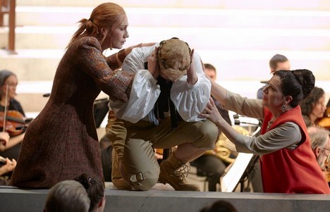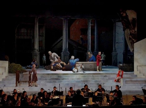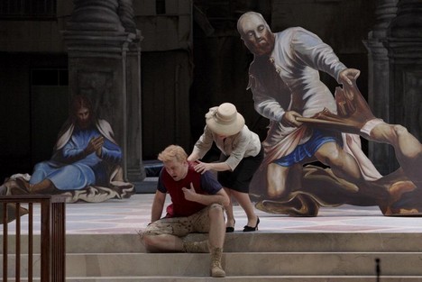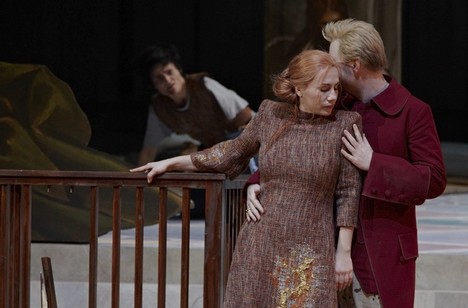 Jossi Wieler a Sergio Morabito na scéne a v kostýmoch Anny Viebrockovej rozohrali príbeh s delikátnou miešaninou vážnej drámy a humorného odľahčenia. Tomu prisluhovala myšlienka aranžovať dej ako „divadlo na divadle“, kde sa skupina mladíkov z dnešného športového oblečenia preoblieka do zľahka historizujúcich kostýmov. Dramatické situácie síce ústia do šťastného konca, no inscenátori ho nechávajú akoby otvorený, keď počas záverečnej orchestrálnej chaconny sa herci vyzliekajú z odevov divadelných opäť do športovo-civilných. Dejisko je jednoduché a takmer nemenné. Všetko sa odohráva na námestíčku s kamennou fontánkou, v pozadí sú fasády ošumelých, vojnou poznačených domov, kašírované „textilné“ stĺpy, v popredí mramorové schodisko prepájajúce javisko so zdvihnutou orchestrálnou jamou. Objavujú sa aj historické Tintorettove maľby. Celé prostredie na jednej strane harmonizuje s vojnovými udalosťami (napríklad nohavičková postava Vologesa prišla v bojoch o jednu ruku), na druhej vytvára odľahčujúci odstup, dokonca jedna scénka sa odohráva v diváckych radoch. Najvyššiu mieru režisérskeho majstrovstva však Wieler s Morabitom dokázali v práci so sólistami. V tri a polhodinovom predstavení niet jedinej sekundy, keď spevák stojí pasívne na rampe. Nasadenie je stopercentné a úžasné.