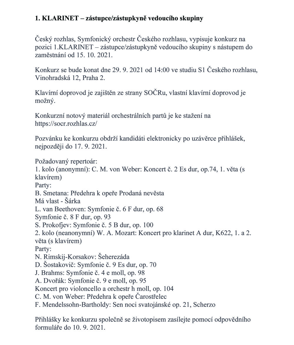 Inzerce Symfonický orchestr Českého rozhlasu hledá hráče na klarinet Publikováno 21/07/2021 sdílejte: 0 minut čtení sdílejte: Do výběrového řízení se můžete přihlásit online přes stránky Českého rozhlasu. TémataSeznam inzerátů Sdílet článek Facebook email zkopíruj odkaz vytisknout sdílejte: Předchozí článek Marion z Manchesteru – Mahlerova nejdůležitější múza Další článek Vivaldiho Farnace po téměř tři sta letech opět zazněl v Praze 0 0 hlasy Ohodnoťte článek Odebírat Přihlášení Upozornit na nové a další komentáře nové odpovědi na můj komentář Label {} [+] Jméno* E-mail* Webová stránka Label {} [+] Jméno* E-mail* Webová stránka 0 Komentáře Nejstarší Nejnovější Most Voted Inline Feedbacks Zobrazit všechny komentáře Načíst další