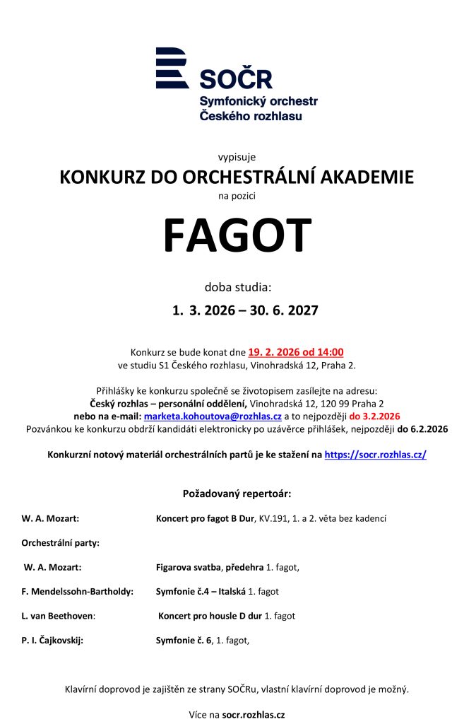 Inzerce Symfonický orchestr Českého rozhlasu vypisuje konkurz do orchestrální akademie na pozici fagot Publikováno 12/12/2025 sdílejte: 0 minut čtení sdílejte: TémataSeznam inzerátů Sdílet článek Facebook email zkopíruj odkaz vytisknout sdílejte: Předchozí článek Vánoční kantáta pro UNICEF nepřinesla laciné předvánoční tretky, ale obohatila posluchače o skutečnou poezii adventu Další článek Operní panorama Heleny Havlíkové (557) – Něco na té Arabelle je 0 0 hlasy Ohodnoťte článek Odebírat Přihlášení Upozornit na nové a další komentáře nové odpovědi na můj komentář Label {} [+] Jméno* E-mail* Webová stránka Label {} [+] Jméno* E-mail* Webová stránka 0 Komentáře Nejstarší Nejnovější Most Voted Inline Feedbacks Zobrazit všechny komentáře Načíst další