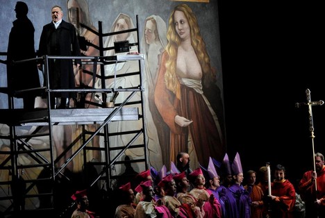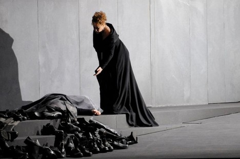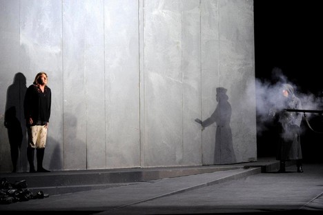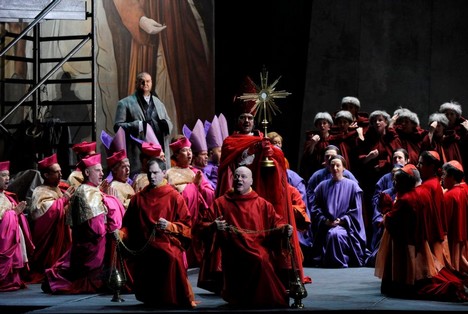 Anticky strohá je už samotná scéna drážďanské Tosky (Christof Cremer), v prvním jednání tak trochu připomínající moderní minimalistickou, pouhé půlstoletí starou katedrálu v norském Tromsø; její prakticky holé stěny zůstávají na scéně jen s mírnými obměnami a jakoby stále se zužujícím sevření i v dalších dvou dějstvích, strohost je patrná i v kostýmování (Petra Reinhardt), stejně jako i v režijním aranžmá především sborových scén prvního jednání.