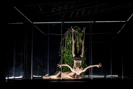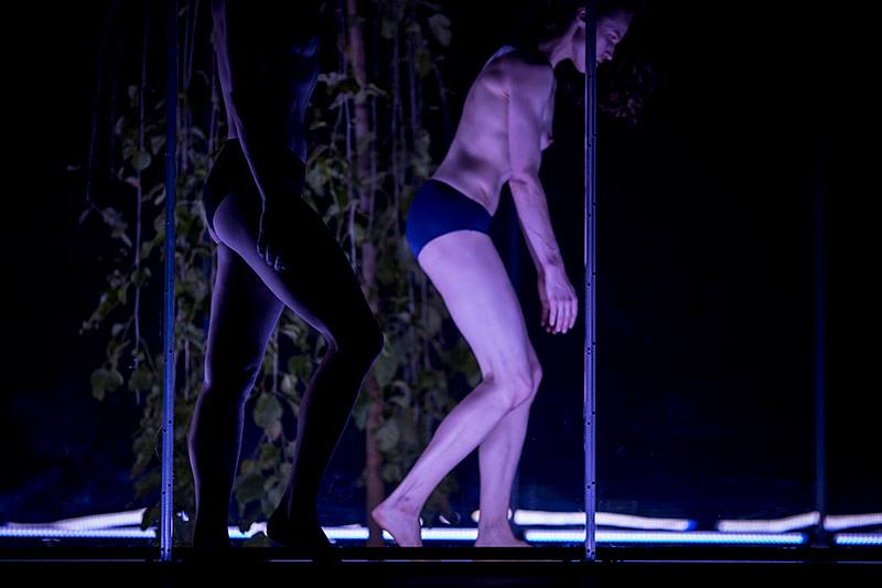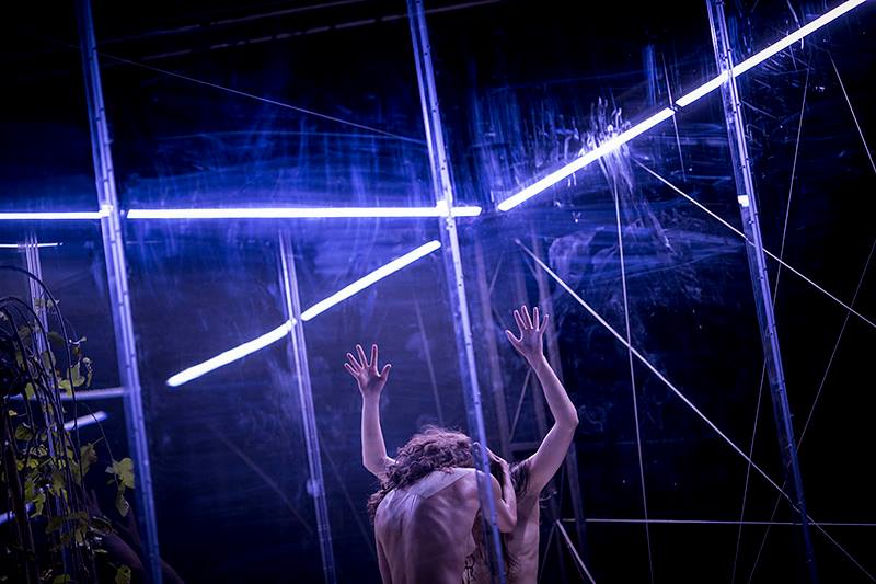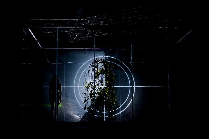Svou scénickou koncepcí je dílo objektem, který divák nazírá z jisté vzdálenosti: hlavním prvkem je ohraničený prostor, jakási krychle z plexiskla osvětlená zářivkami, v jejímž středu se zelená strom a v jejímž prostoru a po celé bytelné konstrukci se odehrává pohybová akce. Návštěvník je také oddělen od okolního světa a sám je izolovaným objektem podobně jako ten, na nějž se dívá – a dopomocí sluchátek, do kterých si dle výběru může pouštět buď hudbu (David Kollar), anebo text eseje, který mu osvětluje dění na jevišti, ale současně tříští jeho pozornost.
