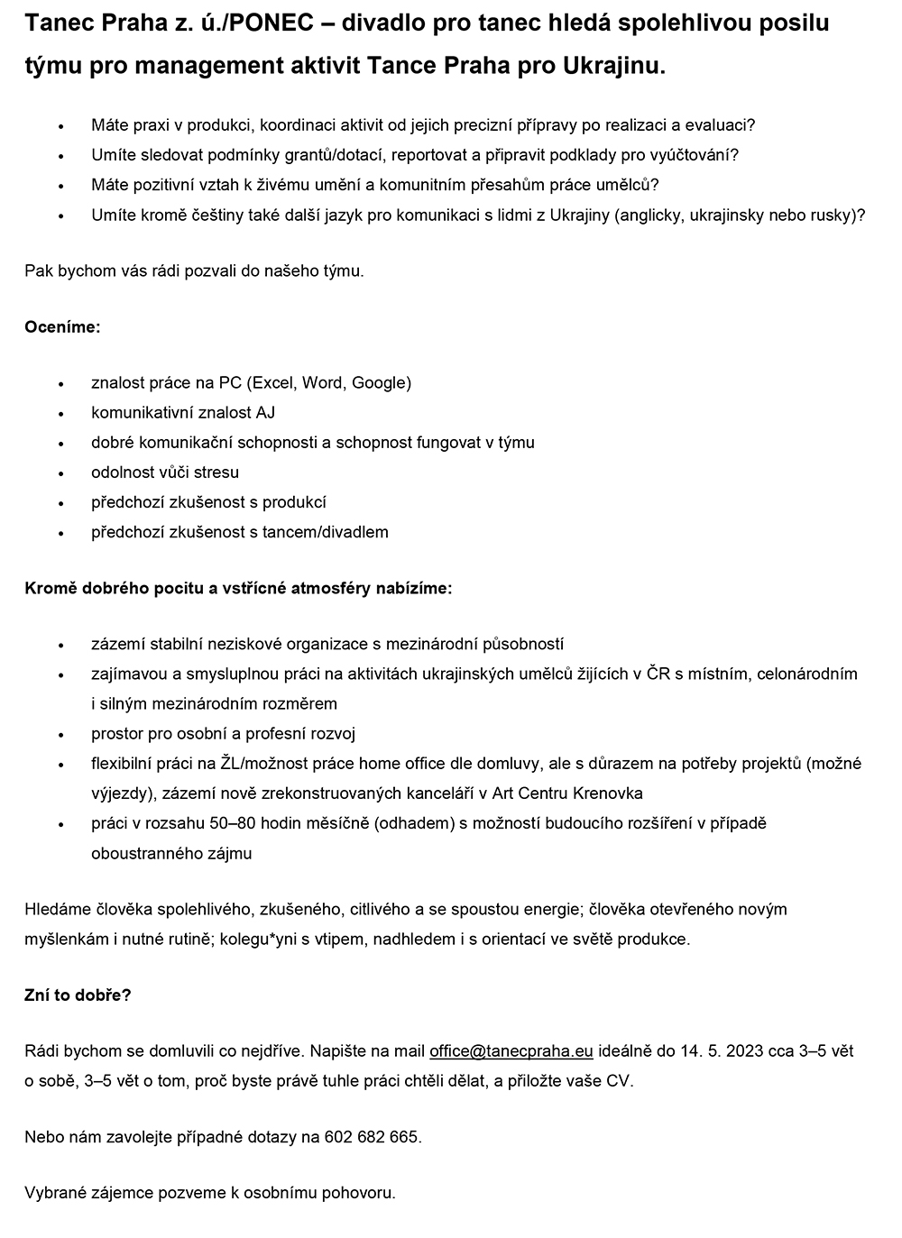 Inzerce Tanec Praha hledá posilu týmu pro management aktivit pro Ukrajinu Publikováno 28/04/2023 sdílejte: 0 minut čtení sdílejte: TémataSeznam inzerátů Sdílet článek Facebook email zkopíruj odkaz vytisknout sdílejte: Předchozí článek Koloraturní sopranistka Jana Jonášová dnes slaví 80. narozeniny Další článek Skladatel Jan P. Muchow: Z hudební rezidence v Broumově jsem nadšený 0 0 hlasy Ohodnoťte článek Odebírat Přihlášení Upozornit na nové a další komentáře nové odpovědi na můj komentář Label {} [+] Jméno* E-mail* Webová stránka Label {} [+] Jméno* E-mail* Webová stránka 0 Komentáře Nejstarší Nejnovější Most Voted Inline Feedbacks Zobrazit všechny komentáře Načíst další