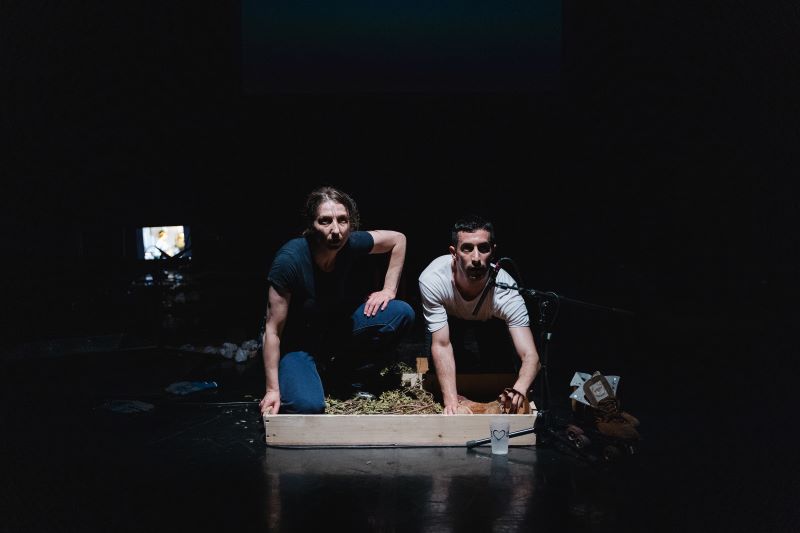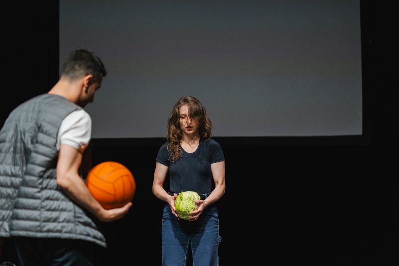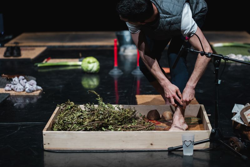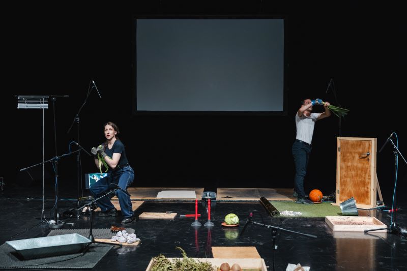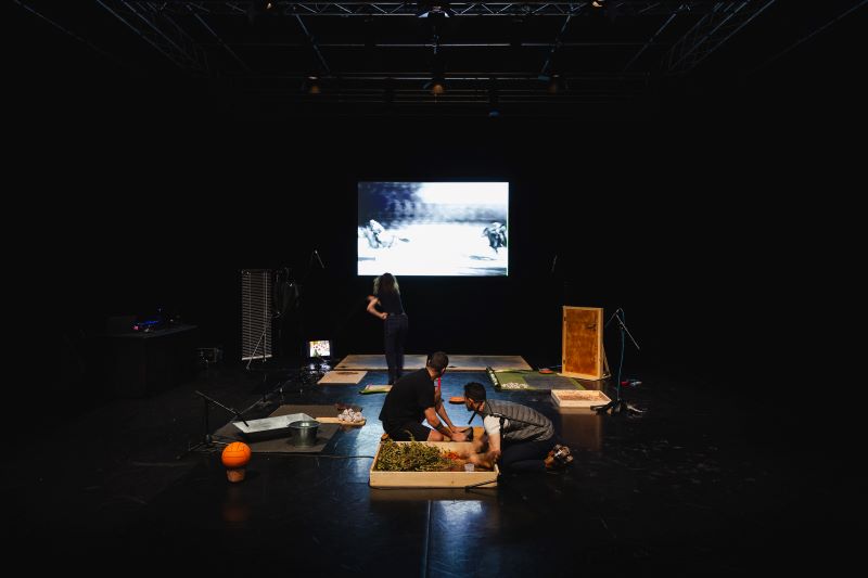 Scénografie nabízela doslovnou „pastvu pro oči“, neboť byla členěna na objektové ostrovy, plochy z různých materiálů od pevných dřevěných povrchů po rohože či seschlé listnaté větve. Jevištní prostor hustě osetý předměty od počátku opanovaly tři osoby, které nejprve působily civilně, dokonce jako by zprvu ani diváky nevnímaly. Performeři se bez otálení pustili do činností, jejichž jádrem byla manipulace s předměty generujícími jakýmkoliv způsobem zvuk: byly urovnávány kameny, nazouvány kolečkové brusle, kropeny vydlabané kokosy… Každý z předmětů vybízel k účelovému pohybu, kameny ťukaly při dopadu na zem či se třely o sebe, rytmizovaná sekvence se skořápkami ořechů zas tradičně navozovala koňský cval.