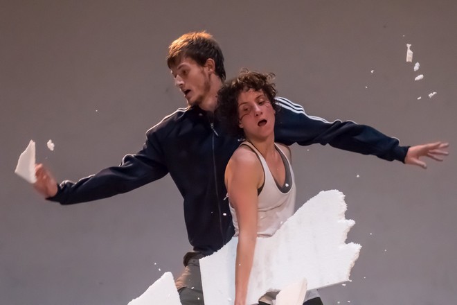 Pod hlavičkou souboru DOT504 vznikl nový projekt, který měl premiéru 17. října v divadle Ponec. Minulou sezonu DOT zabodoval s inscenací Collective Loss of Memory (naši recenzi najdete zde), dílo v čistě mužském a mužném obsazení se stalo Taneční inscenací roku. Letos jako novinku představil duet, který vznikl v mezinárodní koprodukci: v choreografii Paula M Blackmana a Christiane Gouzelis, což je tandem australsko-řecký, účinkuje Belgičan Nathan Jardin a Portugalka Teresa Noronha Feio. Námět jejich hodinové jevištní existence s názvem Physical Jerks je univerzální pro celou současnou společnost. Diváci jsou zváni k nahlédnutí do života dvojice mladých lidí, kteří „denně trénují a cvičí, aby zůstali zdraví a v dobré formě a chránili tak geny svého těla; ale nejspíš jsou to jen dva potomci, tančící v rytmu vlastní DNA, co se baví až k smrti“.