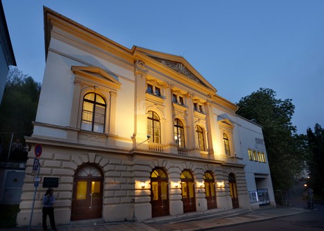 Ještě stručně několik slov ke zdejšímu divadlu. Nese název podle významného rakousko německého činoherního herce Eduarda von Wintersteina (1871-1961), který zde vystoupil v roce 1894 v titulní roli Goetheova Egmonta, hraného jako inaugurační představení nově otevřeného divadla. Pak zde ještě nějakou dobu hrál, než se mu otevřela další hvězdná kariéra na velkých jevištích. Klasicistní divadlo se sálem pro tři sta diváků nebylo naštěstí v žádné válce poničeno, pouze prodělalo některé modernizace a přestavby, které ale podstatně nezměnily jeho roztomilé původní průčelí.