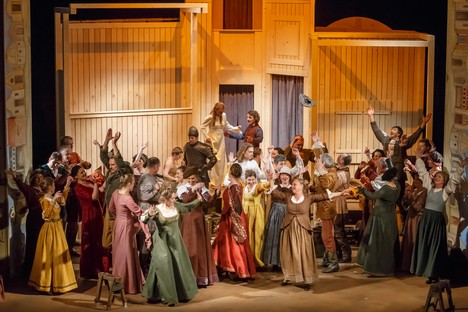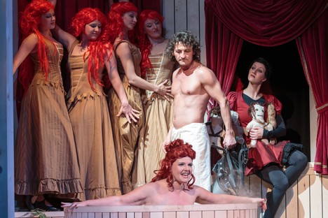 Režisér představení a také ředitel divadla v Annabergu Ingolf Huhn pojal inscenaci jako hru provozovanou v městském prostoru, kde část účinkujících v pěkných dobových kostýmech divadlo hraje a další přihlíží třeba vsedě jako diváci. Často se však všichni promísí dohromady. Sbor, který někdy dělá dojem, že se na malé jeviště nevejde, je vůbec téměř hlavní hybnou představení. Choreograficky s extra baletem postavila představení Sigrun Kressmann.
