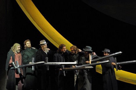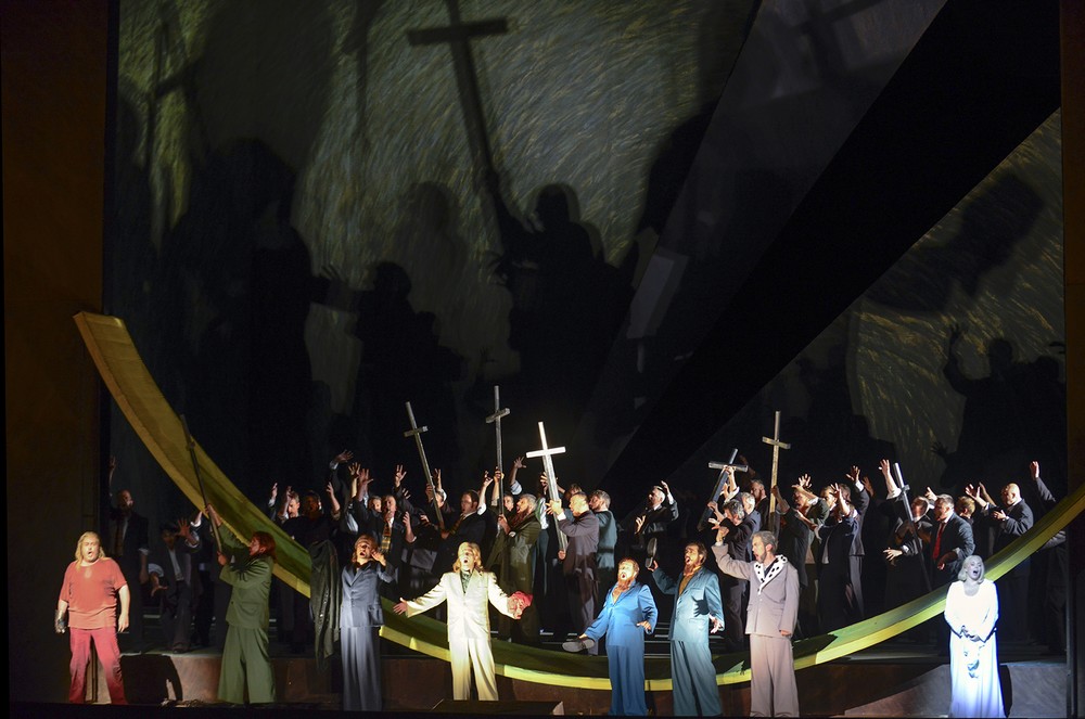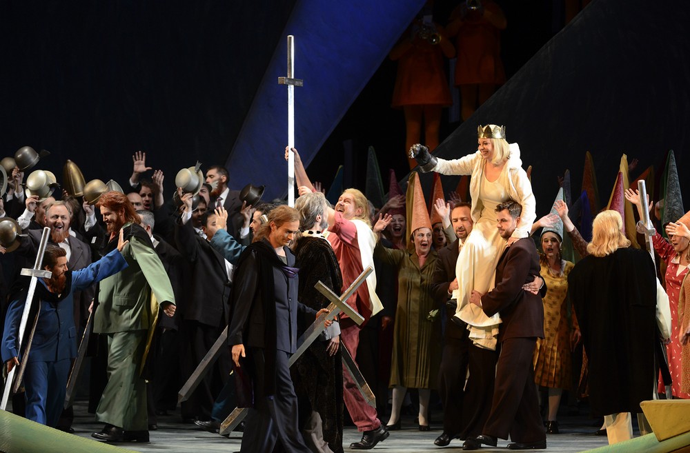 Nastupuje veliký, dokonale sezpívaný a skoro stočlenný sbor pod vedením Argentince Pabla Assanteho, ostatně jeho mužská část se již uvedla dokonalým zvukem ve zpěvu poutníků v prvním jednání. Na strmém schodišti sestupuje dlouhá řada trubačů k slavnostním úvodním fanfárám soutěže.