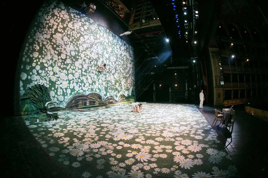 Po přestávce zůstává na prázdném jevišti jen útvar, který se z greenu a měsíce proměnil v orientální stavbu, v případě potřeby průhlednou či průsvitnou. Jsme spolu se stále okouzlenou Lisou v Pekingu a sledujeme Sou-Chonga, na nějž coby premiéra neustále dohlíží jeho přísný strýc Fu-Li, princovu opuštěnou sestru Mi a starého známého Gustava, jenž právě do města dorazil coby rakouský vevyslanec. Největší hit operety, píseň Dein ist mein ganzes Herz (v italském překladu Tu che m’hai preso il cuor), zpívá princ obrysu Lisiny postavy, který se působivě odráží na stěnách budovy. Je Lisa, skrytá uvnitř, opravdu šťastná, nebo se nachází ve „zlaté kleci“? Zdá se, že správná je spíše druhá varianta, a navíc se ukazuje, že podle tradice se bude muset dívka dělit o Sou-Chonga s dalšími čtyřmi ženami. Sen se jí hroutí a rozhoduje se proto za pomoci Mi a Gustava pro útěk; i když selže, ušlechtilý princ jí přesto dává svobodu. Scéna se opět noří do tmy a znovu se objevuje pruh látky z počátku příběhu. Tentokrát symbolizuje vlny nedozírného oceánu, pochopitelně znovu ozářené měsíčním svitem…+++