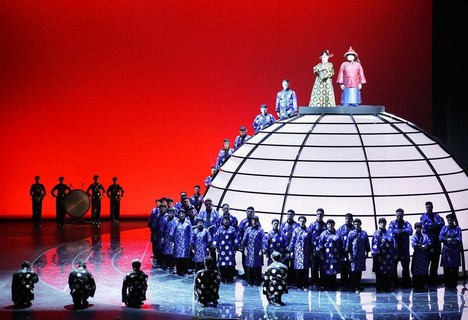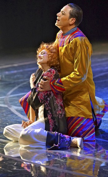 Po přestávce zůstává na prázdném jevišti jen útvar, který se z greenu a měsíce proměnil v orientální stavbu, v případě potřeby průhlednou či průsvitnou. Jsme spolu se stále okouzlenou Lisou v Pekingu a sledujeme Sou-Chonga, na nějž coby premiéra neustále dohlíží jeho přísný strýc Fu-Li, princovu opuštěnou sestru Mi a starého známého Gustava, jenž právě do města dorazil coby rakouský vevyslanec. Největší hit operety, píseň Dein ist mein ganzes Herz (v italském překladu Tu che m’hai preso il cuor), zpívá princ obrysu Lisiny postavy, který se působivě odráží na stěnách budovy. Je Lisa, skrytá uvnitř, opravdu šťastná, nebo se nachází ve „zlaté kleci“? Zdá se, že správná je spíše druhá varianta, a navíc se ukazuje, že podle tradice se bude muset dívka dělit o Sou-Chonga s dalšími čtyřmi ženami. Sen se jí hroutí a rozhoduje se proto za pomoci Mi a Gustava pro útěk; i když selže, ušlechtilý princ jí přesto dává svobodu. Scéna se opět noří do tmy a znovu se objevuje pruh látky z počátku příběhu. Tentokrát symbolizuje vlny nedozírného oceánu, pochopitelně znovu ozářené měsíčním svitem…+++===Výtvarná stránka inscenace se naštěstí po celou dobu trvání představení neokoukala, a tak se absence výrazných režijních nápadů na jejím fungování téměř neprojevila. O trochu vzruchu se postarala choreografie Sandhye Nagaraje (ansámblové výstupy golfistů, akrobatické „servírování kávy“ číšníkem v prvním dějství či bojově-taneční variace palácového personálu v dějství druhém), samotné herecké výstupy a aranžmá hudebních čísel pak zřejmě povětšinou vycházely z italské operetní tradice, která do frivolního vídeňského přehrávání vnáší navíc prvky commedie dell’arte a cirkusové živelnosti (více jsem se tomuto fenoménu věnoval v recenzi z terstské Veselé vdovy z roku 2012 zde).