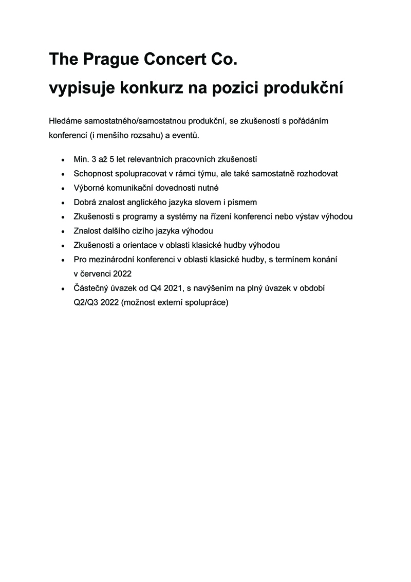 The Prague Concert Co. vypisuje konkurz na pozici produkční