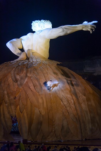 K monumentálnej soche a výprave Amry Bergman sa dostávam až teraz, hoci práve ona bola tým najokatejším vábnikom či „tvárou“ inscenácie. Umelkyňa v tomto smere ako jediná priniesla do dvadsaťročných dejín festivalu (z nich sledujem asi polovicu, kde svetlou výnimkou bol Don Giovanni na menšej Ruffiniho scéne roku 2011 v réžii Thila Reinhardta) radikálnu inováciu. Naprojektovala a zrealizovala monumentálnu sochu na točni umiestneného anjela (do pol pása akéhosi „fitness guru“) so „sukňou“ zloženou zo šesťsto sedemdesiatich dielcov poskladaného peria, ktorá sa otvára ako opona. Vo vnútri je umiestnená projekčná mega stena, filmovým spôsobom reflektujúca dej, jeho zmeny i simultánne akcie. Je to projekt, ktorý skôr harmonizuje s neštandardnými rozmermi javiska, menej už kooperuje s daným prírodným exteriérom.