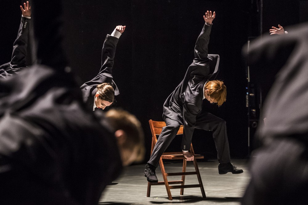 Vždy na konci jeden tentýž tanečník vypadne z řady, padá na břicho ze židle. A pak všichni v kanonickém postupu zleva doprava jakoby vykřiknou, vylítnou a vyhazují bezbranně ruce vysoko nad hlavu a zase pomalu sedají zpět do ochable skleslé pozice. Nic víc a nic míň. To opakování vyvolává představy o věčném hledání, o nucené práci, o povinné cestě. Nemůže se jen tak přestat v úsilí, musí se jít dál, kráčet vpřed, tak jako v životě nebo na vojně, ve válce. Jen někdy, občas, někdo vypadne z řady. A pak snad, začnete znovu.