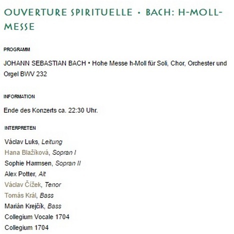 Český barokní orchestr a jeho vokální ansámbl pod vedením Václava Lukse provedl na Salcburského festivalu v jeho druhém dnu Mši h moll Johanna Sebastiana Bacha, která je úzce svázána s historií Collegia 1704 a provází taktéž oslavy jeho desátého výročí.