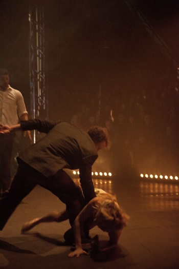 Spor je vyjádřen směsí herecké akce a akrobatických čísel ústřední dvojice a v obdobném duchu se nese i zbytek inscenace: postavy spolu komunikují pohledy i pohybem, civilní pohyb přechází do afektovaného a vrcholem každé scény je akrobatické či jiné efektní číslo.