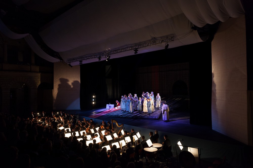 Ambiciózní projekt německého choreografa Uweho Scholze, který je již deset let po smrti, spojil Haydnovo oratorium Stvoření s moderním baletem. Scholz se specializoval na abstraktní nedějové choreografie, vycházející z koncertních děl (symfonie Schumanna, Beethovena, Brucknera, skladby Bouleze), byl znám pietním vztahem k hudebním dílům, která odmítal pro své účely krátit či jinak s nimi manipulovat. Také Haydnovo Stvoření, jeho nejslavnější choreografie, zaznělo v plné dvouhodinové délce. Pěveckých sól se ujali sopranistka Andrea Široká (Gabriel/Eva), sólistka Janáčkovy opery vládnoucí jasným zářivým hlasem, dále basista ze stejné domovské scény Jan Šťáva (Raphael/Adam), kterého jsme mohli loni na festivalu obdivovat v komické roli Klubka v zahradní inscenaci Purcella v Nových Hradech. Jeho výrazný a znělý bas bezpečně obsáhl i nejhlubší polohy Haydnova partu. A trojici sólistů doplnil coby Uriel tenorista José Manuel s celkem nenápadným hlasem a neutrálním výrazem.
