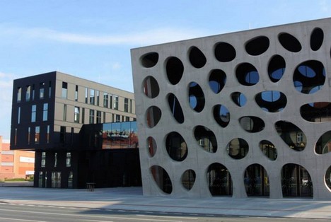 Plzeň je prvním městem v zemi, které po roce 1989 staví nové divadlo, a to za zhruba osm set sedmdesát milionů korun. Dominantou moderní budovy je čelní nakloněná fasáda ze syrového betonu, v níž je třicet devět oválných otvorů, třemi z nich se do objektu vchází.