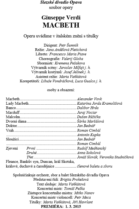 Závěrečnými zkouškami právě v těchto dnech vrcholí ve Slezském divadle přípravy nové inscenace Verdiho Macbetha, který je prubířským kamenem i pro renomované zahraniční scény a zpěváky. +++===Premiéra je naplánována už na příští neděli, tedy 1. března. Macbethem v Opavě bude Alexander Vovk, Lady Macbeth Katarína Jorda Kramolišová, i další party soubor zvládl obsadit ze svých domácích sólistů. Pod hudebním nastudováním je podepsán Petr Šumník, režii má šéfka opavské opery Jana Andělová Pletichová.