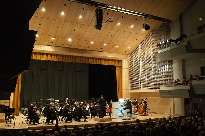 Hrací stůl je mobilní, v tomto případě stál na pódiu tak, aby publikum varhaníka dobře vidělo. Až v posledním díle byl integrován do orchestru, za kontrabasy. Umístění varhanního prospektu symetricky po stranách nad pódiem a ne v čele je v síni, občas používané přece jen i pro další účely, logické. Logiku má i umístění do skříní za lamely, aby píšťaly vizuálně interiéru nedominovaly. Jen jejich zvýraznění nasvícením zevnitř ještě nefunguje, takže byly varhany při koncertě v podstatě neviditelné. Byl to však jediný nedostatek, jinak vše nasvědčovalo tomu, že jde o zdařilé dílo.