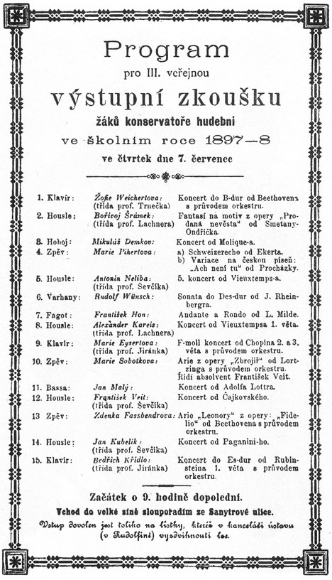 Vraťme se však ještě k malému konzervatoristovi Jeníkovi, který podle vyprávění životopisců každé ráno šlapal cestu z Michle do centra Prahy, vyzbrojen obyčejnými houslemi jakéhosi pankráckého houslaře, s padesáti krejcárky v kapse na oběd, cestou ze Spálené do Opatovické ulice na Novém městě fanfárou z Libuše vyvolal svého nejmilejšího spolužáka Bohuslava Lhotského (pozdějšího primária slavného Ševčík-Lhotského kvarteta) a pokračoval společně s ním za studijními povinnostmi.