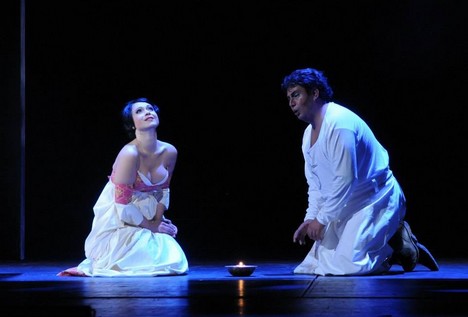 Diváky toužící po efektu velkých scén zřejmě trochu zklame až přílišnou scénickou skromností. Režisér pracoval na scéně, imponující dobrým využitím hloubky jeviště, preferoval zřetelně variabilitu a diferenciaci mnoha světelných efektů. Působí promyšleným, exaktním dojmem, stejně jako výtvarné obrazce jednotlivých aktů, důmyslně prostorově vystavěných. Spolu se světelnými efekty jako důležitým leitmotivem akcentace dominantních postav příběhu. Chce zvýrazňovat vývoj jemnou psychologií vztahů právě mnoha imaginativními vidinami a fantaziemi. Preference světelných efektů zároveň vynahrazuje chudší davové scény, které si zřejmě nechtějí hrát na možnosti velkých divadel a amfiteátrů à la Verona. Důsledná práce se světly tvoří zároveň komornější základnu koncepce. Pravda, řada diváků zde jistě čeká poněkud víc. Oslavné scény před branami Théb, kde jsou vítány vítězné voje Radama, Aida poznává v davu zajatých Ethiopanů svého otce (zde je spolu s králem Amonasrem pět ubohých zajatců, nezbylo jich tedy z bojů věru mnoho), jsou dík světelným imaginacím poněkud utápěny ve tmě. Kužel světla, zaměřený vždy jako leitmotiv na dominující aktéry děje, nedává svou prudkostí možnost vidět ostřeji mimiku pěvců. Nedostatek světla během večera mi vadil, až jsem během díla doslova živočišně toužil po plném nasvícení scény, alespoň na chviličku, aby se očím trochu ulevilo… Právě v takovém místě Triumfálního pochodu, kde jsem na ono – „budiž světlo“ – tolik toužebně čekal. Trompety „aidovky“ situované do protilehlých lóží pro vzácné hosty, zazněly břeskně, na jevišti simulovány pantomimou baletních umělců. Více jsem ale očekával trochu v interakci postav, zejména první obrazy působily poněkud staticky, rozpačitě, dialogy postav jakoby teprve nacházely potřebný stupeň výrazového napětí v komunikaci. Někdy se režisér spokojil s prostým aranžmá, které chce zřejmě nekomplikovat pěvcům pohyb po jevišti a soustředit je víc na aspekty pěvecké. Ale je jistě výborné, podtrhuji dvakrát, že režie nikdy nedopouští sklouznutí k opernímu klišé, k mnohdy zastaralým gestům, jak je dnes někdy v Čechách neradi, s údivem pozorujeme.