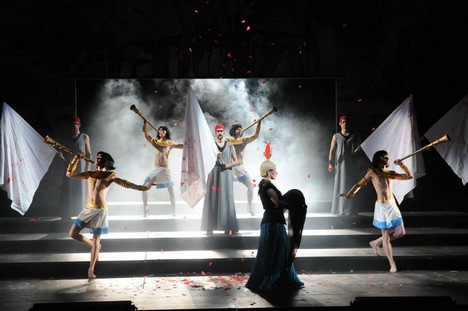 Nový šéf opery, režisér Tomáš Pilař, zaujal již letos v lednu režií prvotiny Bohuslava Martinů, takže si sám sobě nastavil pro režii Aidy vysokou laťku, byť ve zcela odlišném stylu. S osvědčeným scénografem Danielem Dvořákem, který vytvořil jednoduchou funkční scénickou základnu pro odvíjení děje. Zvolil rozčlenění jeviště monumentálními kamennými stěnami, které vytvářejí funkčně vhodný, variabilní scénický model pro rychlé proměny obrazů.