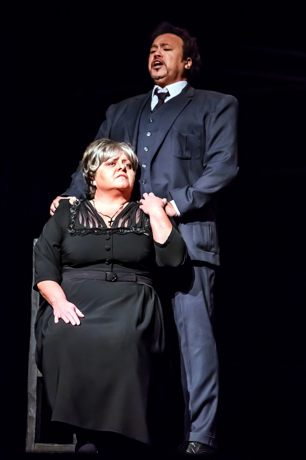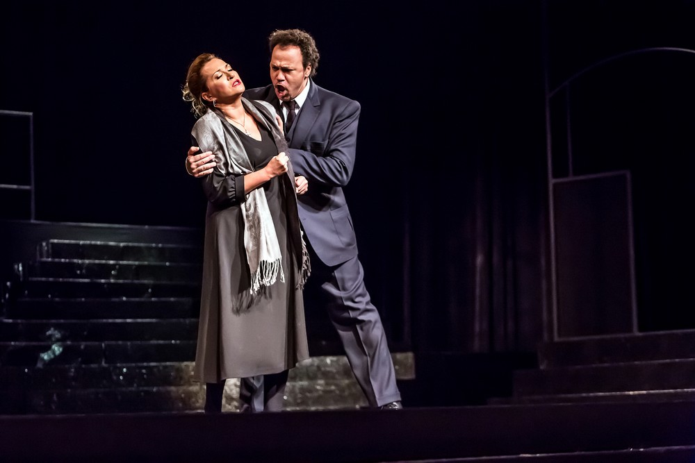 Z pěveckých výkonů stála v popředí ruská sopranistka Olga Romanko v roli Santuzzy. Temně zabarvený, zvukově příjemný soprán dramatičtějšího charakteru s jistými, kulatými výškami, krásně klenutými hudebními frázemi, budil na premiéře zcela oprávněnou pozornost. Jen zrak, často trochu zaměřený do země či k dirigentovi než na pomyslný balkon, mi byl záhadou. Trochu se tím pěvecky výtečná a sympatická sopranistka připravuje o část výrazové sdělnosti. Tenorista Lázaro Calderón, dokonce až z Portorika (vskutku multikulturní České Budějovice dneška!), je lyrický tenorista krásného témbru, pěkně koncentrovaný ve špičce svého ne sice objemného, ale o to víc v prostoru auditoria nosného fondu. S naprosto spolehlivou prvooborovou tenorovou polohou, která se plně ukáže hned v poloze nesnadné vstupní serenády o líbezné Lole. Zde je režií situována za scénou, což trošku znesnadňovalo rytmickou přesnost na obou premiérách, danou i snahou o agogiku temp, možná přílišnou. Tak jako v pijácké písni, která je ale na jevišti a v popředí scény. Trio hlavních postav doplnil zejména ve zvuku krásně voluminózních středních poloh  Alexander Beň v roli Alfia. Miroslava Veselá se prezentovala rolí svůdné Loly, kterou zpívá bez alternace. Partie sice podstatně menší než tři zmíněné, leč pro vývoj děje zcela zásadní. Jako stará máti, přesněji Mamma Lucia, se představila Dagmar Volfová a ukázala, že opravdu není malých rolí, o kteréžto pravdě nás přesvědčoval legendární Stanislavský. A zpochybňovalo se to dovětkem – ano, jsou jen malé gáže… Dagmar Volfová působila přesvědčivě, což je ono kouzelné divadelní slůvko, v němž je skryto vše.  Zpívá roli také bez alternace, takže ji každý návštěvník repríz tohoto operního dvojvečera uvidí.