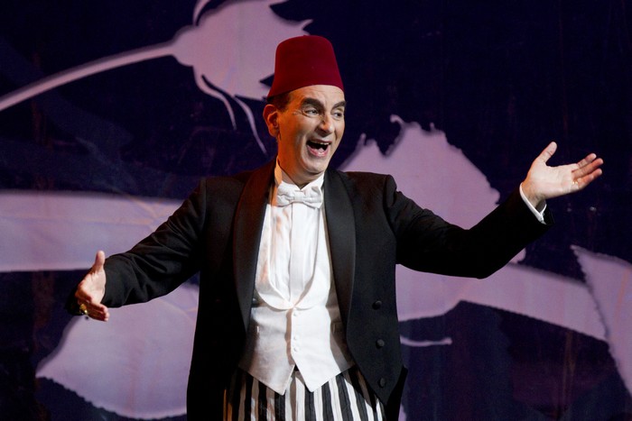 Mimochodem – itaština Veselé vdově neobyčejně sluší (hraje se v milánské edici Suvini a Zerboni) a je radost poslouchat i dialogy. Z toho, co jsem měl možnost vidět a slyšet, jsem získal dojem, že italská operetní tradice vychází spíše z commedie del arte, než z vídeňského lidového divadla a singspielu. Její herectví je tak ve značné míře fyzické a prvoplánové, ale nikoliv lascivní a hlavně příjemně sebeshazující. Dokonalým představitelem tohoto stylu herectví byl v terstské Veselé vdově Gennaro Cannavacciulo v roji Njeguše. Herec se zkušeností s řadou filmových a televizních rolí, ale zároveň operetní specialista, dal svému Njegušovi cosi z podivnosti Kabaretiéra z muzikálu Kabaret. Jeho přítomnost na jevišti byla nepřehlédnutelná – neustálé taneční kreace, vlnění a zaujímání nejrůznějších bizarních póz doprovázel obvykle kamenným výrazem ve tváři, což muselo spolehlivě pobavit i ty diváky, kteří lehké múze ve větším měřítku neholdují. Znalci Veselé vdovy vědí, že Njeguš je postavou, která prakticky žádný prostor ke zpěvu nedostává. V terstské inscenaci to na začátku třetího dějství vyřešili přidaným kupletem o nočním životě v Paříži, ve kterém se Cannavacciulo opravdu blýskl. Asi není divu – jak jsem později zjistil, vydal před několika lety nahrávku populárních italských kabaretních písní.
