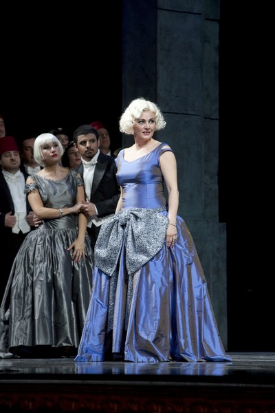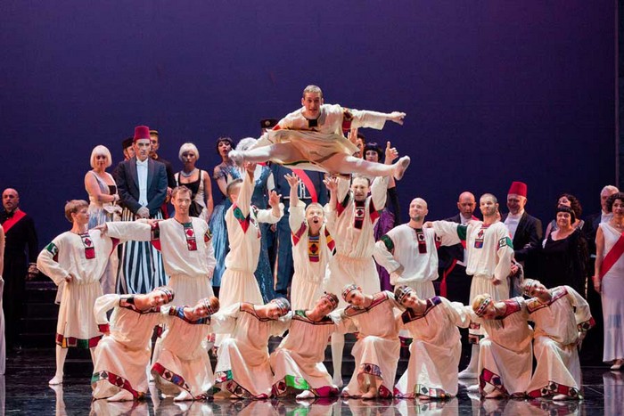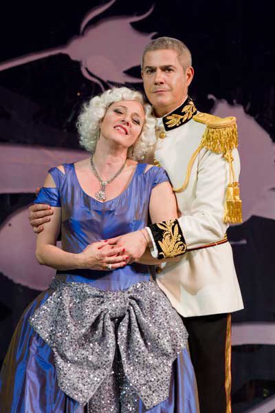 Při pohledu na obsazení hlavních rolí jsem si vzpomněl na první a patrně i poslední pokus veronské Arény o uvedení operety do svého do té doby striktně operního programu. V roce 1999 zde v režii Beni Montresora ve Veselé vdově vystoupili Cecilia Gasdia a Andrea Bocelli. Respektovaná operní pěvkyně minulosti a populární krasopěvec z pomezí různých žánrů – že by italský recept na úspěch? Úvaha terstského divadelního managementu šla evidentně podobným směrem. Titulní roli, tedy onu „veselou vdovu“ jménem Hanna Glavari vytvořila Valeria Esposito. Jsou-li mezi vámi pamětníci představení Vídeňské státní opery z druhé poloviny devadesátých let, možná si vybaví, že v těch časech patřila Esposito mezi nejvytíženější koloraturní sopranistky této scény. Donizettiho Lucia, Linda či Adina, Verdiho Gilda, Offenbachova Olympie, ale i Královna noci a Zerbinetta, to vše byly její velké role, které zpívala i v Miláně, Benátkách, Barceloně či New Yorku. Od začátku nového století byla pěvkyně prakticky nezvěstná, a jak jsem měl možnost se aktuálně přesvědčit, byl pro to patrně dobrý důvod. Z někdejší krásy jejího hlasu už toho zbylo opravdu pramálo, zní v některých polohách až nepříjemně a slavnou Píseň o Vilje zazpívala pěvkyně jen s nejvyšším vypětím sil. Jenže opereta není opera, a tak tu zbývá ještě herecká stránka, kterou si Esposito viditelně užívala. Jako celebrita smyšleného knížectví Pontevedro, na jejímž bohatství stojí celá tamní ekonomika, působila naprosto věrohodně a dokonale uměla jevištně prodat i svůj ženský půvab. Hezkým nápadem byl i Hanin příchod v prvním dějství: pontevederští diplomaté v Paříži, kde se děj odehrává, jí vypouštějí z obrovského zlatého trezoru…