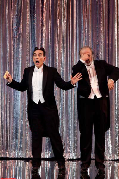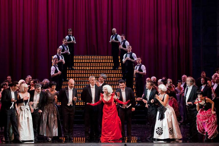 Práci tohoto renomovaného tvůrce měli diváci možnost posoudit i v našich kinech, do nichž byla před časem přenášeno jeho režiní ztvárnění Verdiho Simona Boccanegry z milánské Scaly s Placidem Domingem v titulní roli. Co se týče Veselé vdovy, poradil si s ní podle mého názoru jako zkušený řemeslník: scénu, představující elegantní palácovou dvoranu ve stylu art deco (scénografem byl Edoardo Sanchi) využívá v hudebních číslech v její maximální ploše k roztančeným a efektně zalidněným scénám (výrazně tomu napomáhají nápadité kostýmy Giovanny Buzzy). Z dialogových pasáží naopak vytváří jakési forbíny – za protagonisty se v tu chvíli snesou opony různé výšky a různého provedení (rudý samet, lesklá stříbřitá plocha, průhledný materiál, rámovaný květinovými motivy). Umožňuje to připravit aranžmá a případné přestavby pro další hudební číslo, divák získává dojem, že se prostředí před ním pestře obměňují a zároveň se může soustředit na spojovací dialogy, které tak získávají potřebnou intimitu.