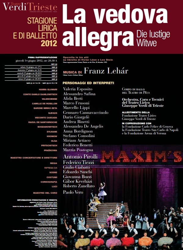 Z výborně připraveného divadelního programu jsem se dozvěděl, že historie provádění Veselé vdovy Franze Lehára v Terstu je přímo dech beroucí. 27. ledna 1907, tedy jen něco málo přes rok od vídeňské premiéry, jí ve zdejším Teatro Filodrammatico coby horkou novinku řídil skladatel osobně, načež tu pod názvem La vedova allegra zdomácněla a až dodnes se pravidelně objevuje i na prknech Teatro Verdi. Program obsahuje kompletní obsazení a inscenační týmy všech inscenací operety od roku 1971 do současnosti, a při jeho pročítání jsem nevěřil vlastním očím. Posuďte sami: Hanna Glavari – Elena Zilio, Luciana Serra, Maria Pia Jonata, Fiorenza Cedolins, Amarilli Nizza; Danilo Danilowitsch – Aldo Bottion, Angelo Romero, Roberto Frontali, Dalibor Jenis, Miroslav Dvorský; Camille de Rosillon – Max René Cosotti, Jozef Kundlák, Giorgio Casciarri, Vittorio Grigolo. Mezi dirigenty je možné přečíst si jména Rudolfa Bibla, Daniela Orena, Nikši Barezy či Juliana Kovačeva. Jak vidno, v Terstu přistupují k Veselé vdově nanejvýš zodpovědně…