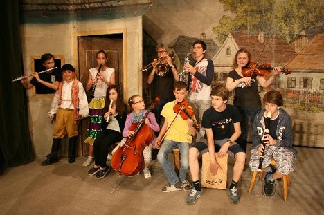 Komorní orchestr tvořili žáci, učitelé i rodiče, ve sboru vypomohly učitelky, děti převzaly i funkce inspicienta a nápovědy, provedení od klavíru řídil Johannes Langer.