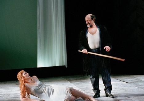 Veristické znázornenie neľútostného mordu podvedeného manžela kazí fraška odpratávania mŕtvoly do „pivnice“, ktorú milenci vylúpnu z časti kulís (asi ako keď Janíčko s Marienkou olupujú perníkovú chalúpku). Scéna, v ktorej starý pijan, náhodne objavivší rozkladajúce sa telo, ťahá tento corpus delicti na motúze na policajnú stanicu, je neskrývanou karikatúrou vtedajších ruských pomerov – opilstva, udavačstva a policajných represálií. Zatiaľ čo režisér pomerne detailne prepracováva výraz protagonistov, vyzneniu väčšiny zborových scén chýba dramatická iskra. Či už ide o výjav sexuálneho obťažovania kuchárky Aksinije, ktorú zboristi prevážajú v akomsi vozíku hore-dolu po javisku, alebo o scénu verejného výprasku Sergeja, či obraz Borisovho skonu, ktorému sa jeho robotníci len tupo prizerajú. Zato aranžmán svadobčanov, v ktorom chýba prirodzene očakávané veselie, sprevádzajúce obvykle takúto udalosť, dáva tušiť, že sa schyľuje k tragédii. Komplexne najpôsobivejšie vyznieva záverečné dejstvo. Na dve časti rozdelené javisko, oddelené nepravidelnou škárou predstavujúcou rieku, ponecháva za ostatným drôtom spiacu mužskú časť väzňov, kým bezcitná ženská polovica sa vysmieva ponižovanej Katerine. Ubiedený národ sa vŕši za vlastné príkorie na ešte biednejšom jedincovi.
