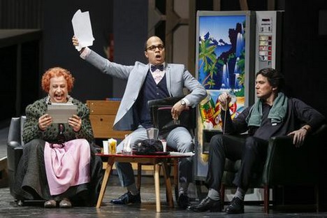 To vše nabízí režiséru Villazónovi příležitost k laskavému zúčtování s hvězdnými manýrami, ješitnostmi i s režijním divadlem. Na skvělé, detailně propracované scéně (s točnou) Fridericha Despalmese pobíhá množství pestrých podivných ptáků (pěkné kostýmy Susanne Hubrich) a Mamma Agata se mění v mateřské monstrum, obhajující „umění“. Jedna pointa stíhá druhou, Villazón si své žerty vychutnává; tu a tam jsou ale hluchá místa. Není to v myšlence, v níž jsou kvůli hře ve hře citovány i Hvězdné války. Výstup Žvejkala v baletní tutu (choreografie Vesna Orlic) je například skutečný vrchol. A také „zpívající plechovka“ (R2-D2) se stará o povyražení. Jenže příliš dobrého se brzy přejí. Že by se proto ozvalo (ostatně přehnané) bučení?