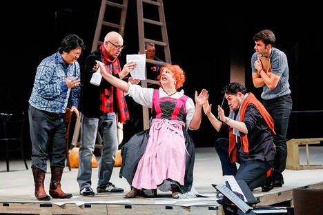 Primadona Corilla (Anja-Nina Bahrmann) označkovává svůj revír už první árií, ale pak přichází do komediantské hry její sokyně – Agata (Martin Winkler), rezolutní ctižádostivá matka druhé sopranistky Luisy (Julia Koci), která chce svou dceru všemi prostředky proboxovat do první linie. Dalšími protagonisty jsou první tenor s minimem inteligence Vladimir (Jörg Schneider) a Corillin poskok v civilní roli manžela Stefano (Daniel Ochoa).