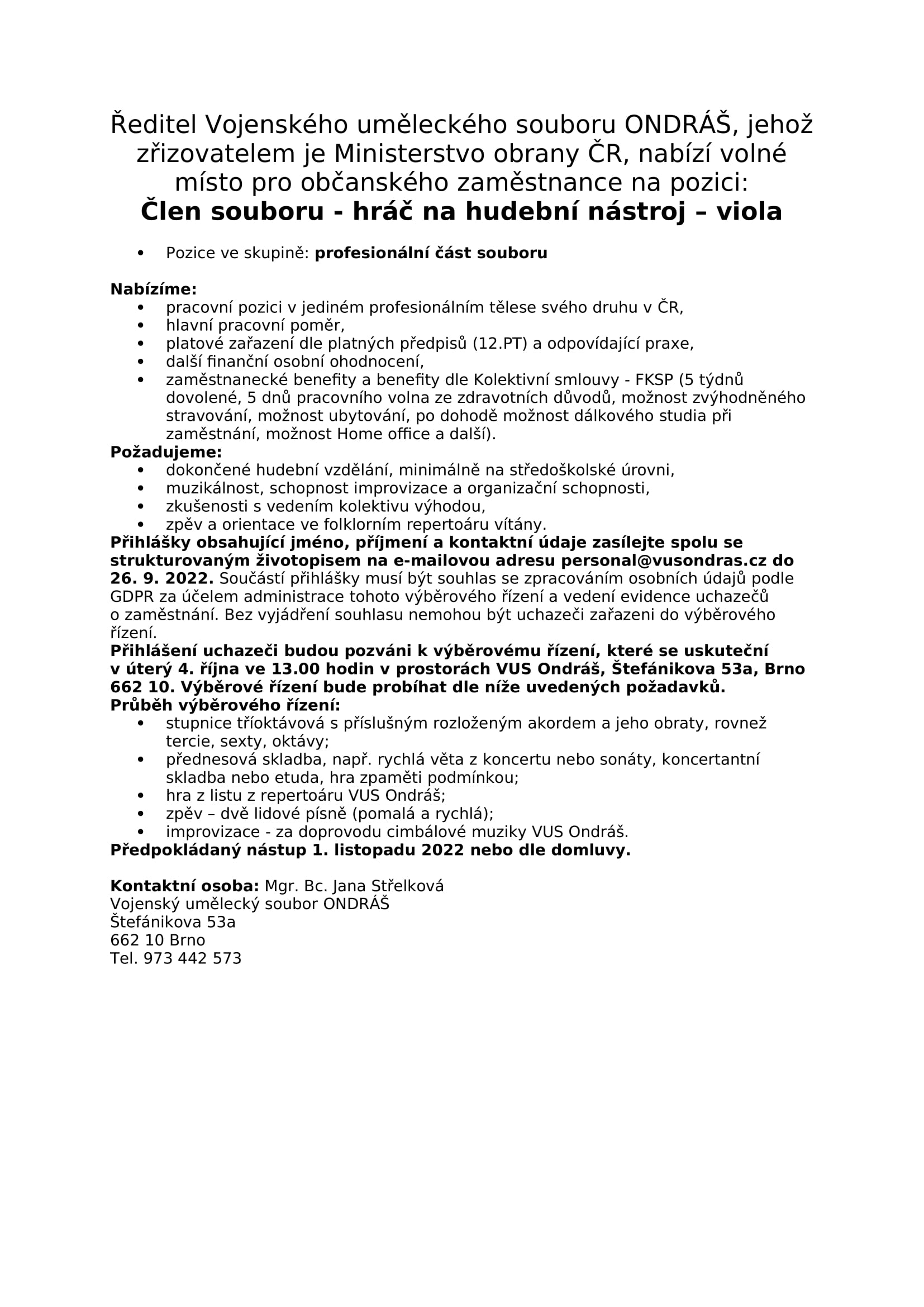 Čtení Vojenský umělecký soubor Ondráš nabízí volné místo pro občanského zaměstnance – hráče na violu