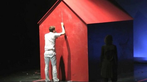 Scénu tvorí jednoduchý tvar klasického domu so sedlovou strechou. Dom ako symbol domova, intimity, súkromia, dom, ktorý mení „farbu“ aj „vlajku“, dom, ktorý môže byť kostolom (reprezentantom viery), je len náš, alebo aj spoločný (môže byť skrátka tu aj tam – kdekoľvek vo svete) a ľahko sa môže zrútiť (ako budova, ako ideál, ako istota i ako psychika). Ako „ambasáda“ nášho myslenia. Tanečníci naň kreslia kriedou grafiku vlajok, symbolov (z mesiaca a hviezdy je zrazu kruh hviezdičiek európskej únie, nad ktorým jeden z nich masturbuje a do ktorého provokatívne vkladá hákový kríž…) – znaky, ktoré sú výstižné, výpovedné a ktoré sa menia z historického hľadiska rýchlo ako čiara. Vypovedajú o násilí, terorizme, o pomýlených hodnotách, o novej „viere“. Dom sa však môže aj otočiť a ukáže svoj interiér evokujúci zastávku MHD. Vec verejnú a nevľúdnu.