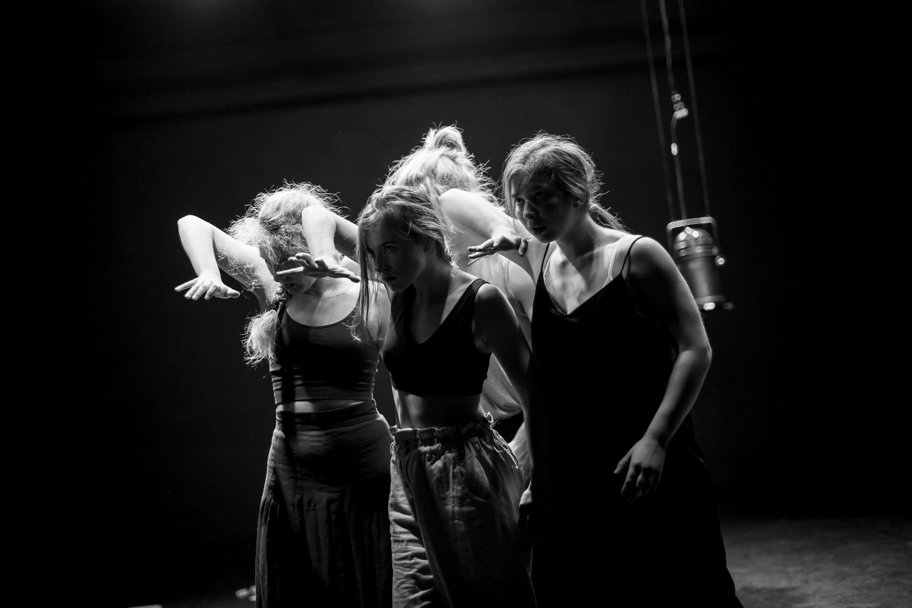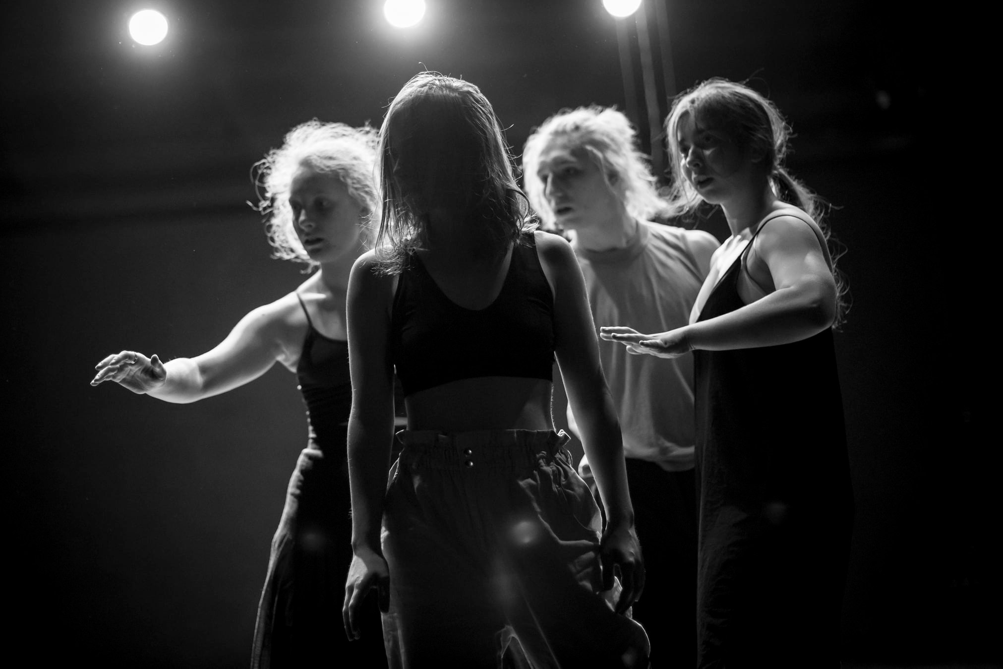 Svým způsobem se i tento tvůrčí kolektiv zasoustředil primárně na obsah a nehledá inovace pro formu a taneční tvarosloví. Je to ale logické s ohledem na jejich kořeny. Pohybová partitura je křehká stejně jako její aktéři, kteří bloudí v tomto světě, kde každý sleduje to, co je ostatním neviditelné, a pak není možné se vztahovat ke společnému cíli, společnému zájmu. Ten svět je temný, prozařují jej čtyři bílá bodová světla v rozích a pět či šest reflektorů po stranách s teplejším odstínem světla, ale i přes jejich počet často tone jeviště (úmyslně?) v temnotě a z performerů nechává viditelné jen obrysy. Snad je v tom také značná dávka intuice a instinktu, nejen šero intimního prostoru, ale i splín, který doprovází onu marnost neexistujících dialogů mezi aktéry, kteří sdílejí prostor, ale ne své světy.