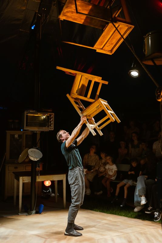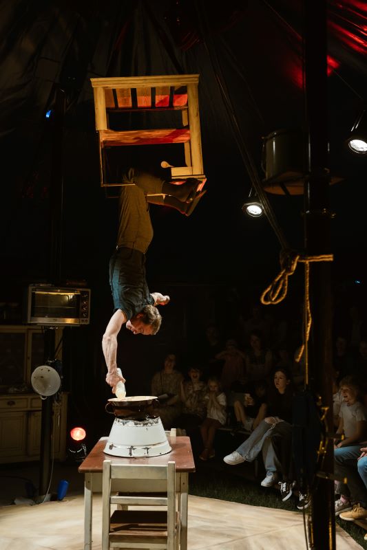 Jde totiž o reálně poctivé akrobatické představení, které využívá rekvizity z běžného života, jen v jiných souvislostech. Michal ve stanu vytvořil miniaturní starosvětskou kavárnu, v níž nechybí funkční trouba a zásobník horké vody na čaj, neboť kulinářské výstupy jsou zcela reálné. Dramaturgicky postupuje od jednodušších akcí s nábytkem a balančních triků s nádobím, které má správnou patinu zašlých časů, stejně jako oprýskaný stůl a další náčiní. Povykující děti nadšeně přihlížejí tomu, jak akrobat připravuje v závěsu hlavou dolů koláč ke svačině, který pak skutečně publiku i servíruje.