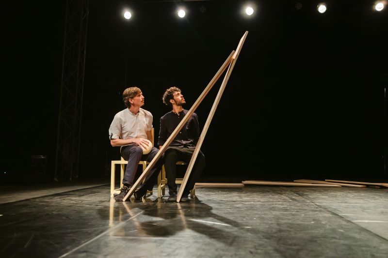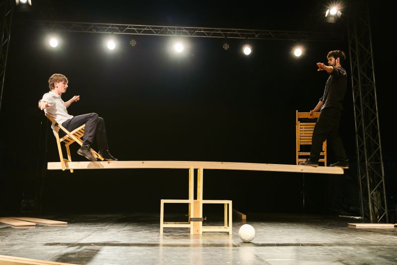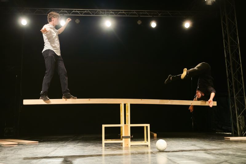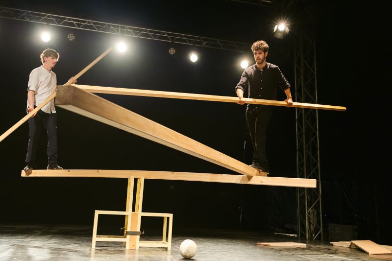 To právě dvojice umělců realizuje, když na scéně experimentuje s fyzikálními zákony a vlastními těžišti, s pomocí různých dřevěných desek, předmětů a židlí. Rámec působí jako dětská hra, jako prozkoumávání možností předmětů tehdy, když se nikdo nedívá, jejich proměna v nářadí či nástroje podléhající jen fantazii. Mění se v lavice, ohrady, překážky, které mají společnou fascinující míru nestability, která tak dobře odráží jinou, naši vnitřní. Možná nás na novém cirkuse nefascinuje už tolik fyzická realita výkonu, jako jeho rozechvělá podstata, která funguje coby neuvědomělá metafora. Zkrátka, jak navenek, tak i uvnitř, takhle život balancuje každý, každou vteřinu v nebezpečí pádu. Je poučné sledovat sehrané umělce, kteří si v tichu dávají jen nepatrné neverbální signály k následující akci, i jejich hluboké soustředění hraničící s odtržením od světa mimo setmělý prostor stanu. Nutno podotknout, že publikum toto specifické vystoupení přijalo tedy bez výhrad, a tak snad i ti diváci, kteří viděli nový cirkus poprvé, o něm získají představu jako o umělecké formě, a nikoliv tělocviku.