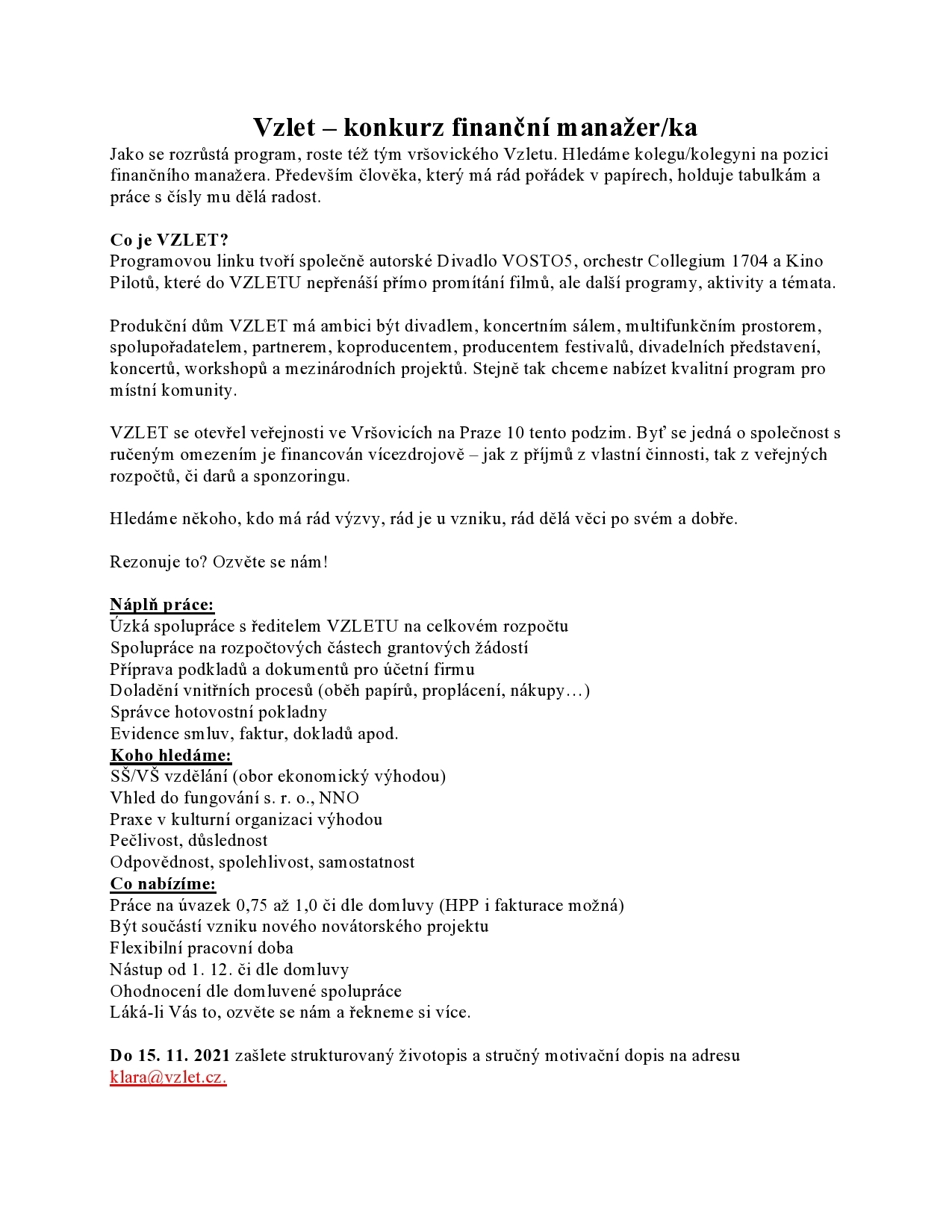 Inzerce Vzlet hledá finančního manažera Publikováno 14/11/2021 sdílejte: 0 minut čtení sdílejte: TémataSeznam inzerátů Sdílet článek Facebook email zkopíruj odkaz vytisknout sdílejte: Předchozí článek Album týdne Normana Lebrechta: Paul Hindemith – Malíř Mathis, Koncert pro klarinet Další článek Collegium 1704 se Simonou Šaturovou lákalo na Myslivečka a nadchlo Mozartem 0 0 hlasy Ohodnoťte článek Odebírat Přihlášení Upozornit na nové a další komentáře nové odpovědi na můj komentář Label {} [+] Jméno* E-mail* Webová stránka Label {} [+] Jméno* E-mail* Webová stránka 0 Komentáře Nejstarší Nejnovější Most Voted Inline Feedbacks Zobrazit všechny komentáře Načíst další