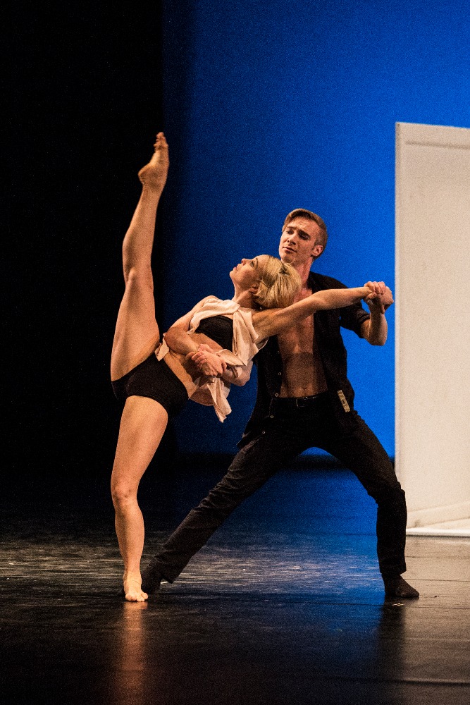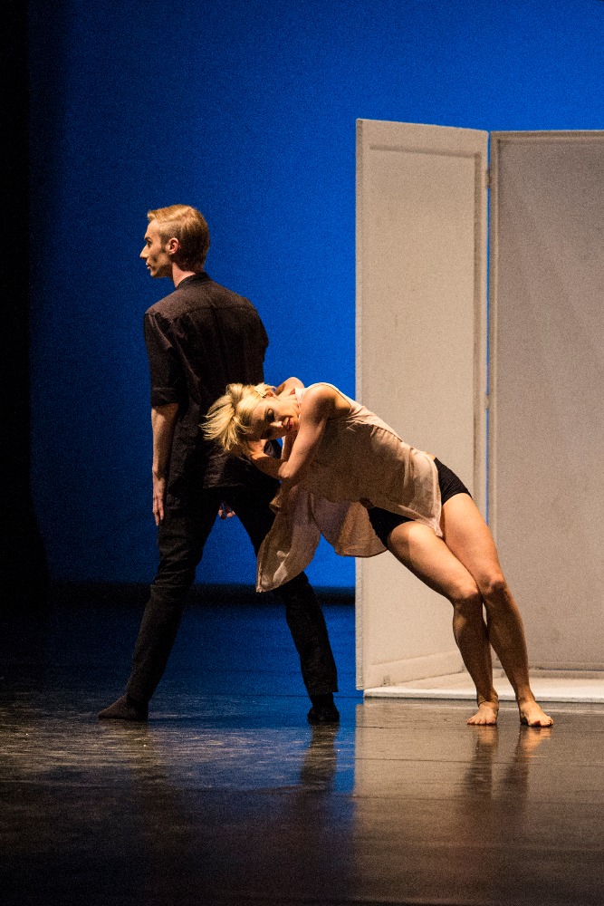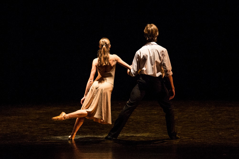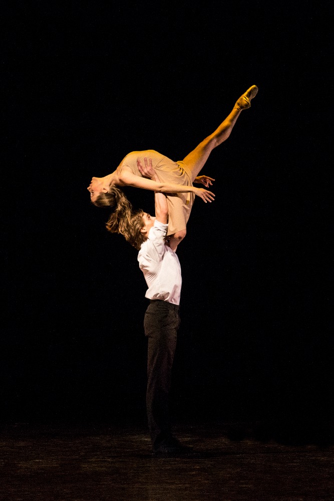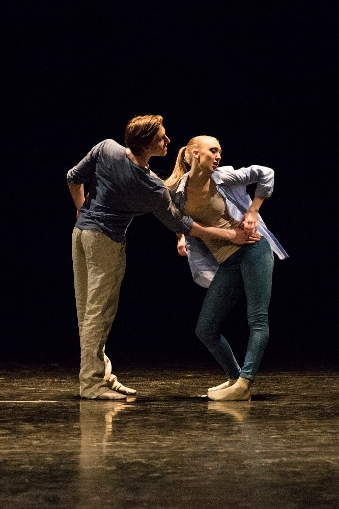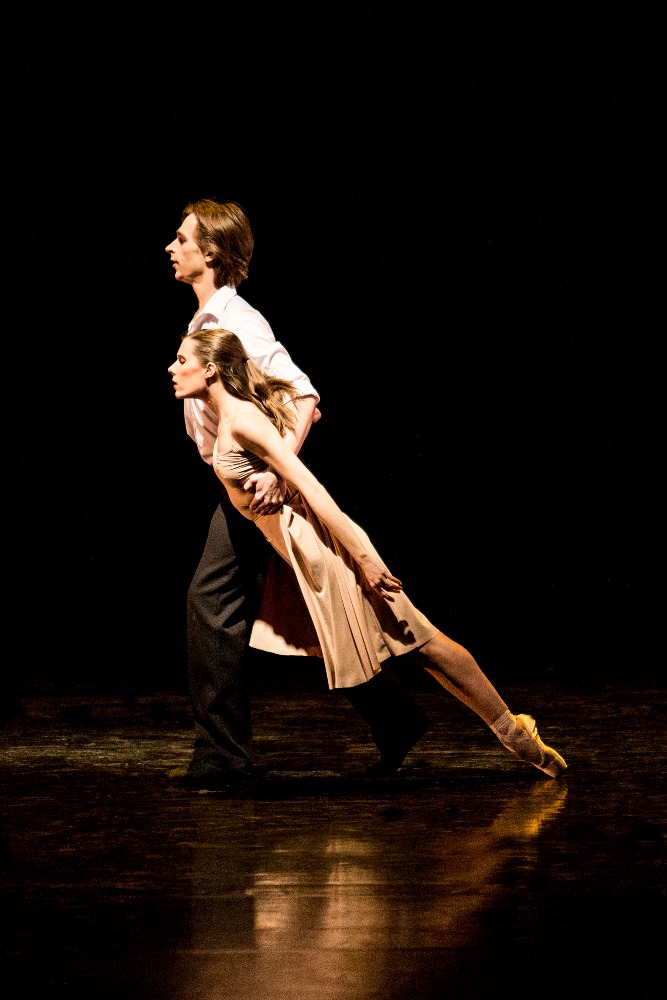 V programu se opakovala choreografie 23:47 Benjamina Hussona zobrazující veselou a vážnou tvář kavárny pár minut před zavírací hodinou. V první části se snaží roztančit své kolegy Gianvita Attimonelliho a Sergeie Gherciu na slavnou skladbu In the Mood z repertoáru Glenna Millera. Ani na repríze jsem si nemohla pomoci od dojmu, že tahle nahrávka je podivně pomalá, pročež i choreografie ztrácí dynamiku. V provedení dominují prvky klasického tance spojené jen s několika málo náznaky jazzu, a to spíš vnějškově a ve snaze o pohybové vtípky. Klasickou variaci lze vystavět prakticky na jakoukoli hudbu, konec konců Petr Zuska to dokázal i na hip hop, ale tahle choreografie je nějak těžká… Druhou polovinu čísla tvoří neoklasický duet, kdy najednou mizí prostředí lokálu a dva mladí lidé se setkávají zřejmě jen v představách. Tančí Pauline Puicercus a Dmytro Tenytskyy a choreografie je sympaticky čistá, s množstvím zvedaček spojených s rotací, provedených s jistotou partnerské souhry.