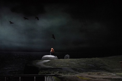 Pokud jde o režii, nechci opakovat zevrubný popis Pavla Horníka a nehodlám ani spekulativně hledat skrytý smysl jednotlivých scén. Zřetelný feministický akcent je zde nepřehlédnutelný: Senta místo smrti volí osvobození se z okovů „předurčenosti“ – zpřetrhá vazby „domova“, sbalí si kufr a odchází. Najít takovouto výkladovou symboliku v dané narativní lince (vykoupení Holanďana čistou láskou) je jistě z hlediska osobní reflexe režisérky Florentine Klepper legitimní, nicméně dle mého soudu, vzhledem k archetypálnímu charakteru příběhu, je tento záměr k dílu necitlivě naroubovaný a interpretačně nevhodně dominující. O pokoře k Wagnerovu dílu či alespoň ke křehkosti a intimitě dějové linky zde nemůže být ani řeči; hudebně-dramatické dílo se zdá být pouze prostředkem k veřejné proklamaci obecné feministicko-ideologické šablony. Záměr režisérky tedy nepřináší divákům nic nového – jedná se o v minulosti do omrzení omílané téma, které je již na poli současného dramatického umění vyčpělé a do kořenů „vytěžené“. Mimo jiné se mi opravdu hodně nelíbila propagandisticky laděná internátně-reprodukční scéna ženského sboru na začátku druhého jednání. Její smysl v rámci ideologické výpovědní symboliky chápu, ale zařazení této scény do dějového i hudebního proudu mi připadá nevhodné, a to i v rámci „leitmotivické“ provázanosti (z hlediska kladného i záporného „komentáře“) Gesamtkunstwerku. Negativní dojem z chladného a konstruktivistického režijního pojetí nezachránila ani prostorově velmi zdařilá scéna (Martina Segna), barevně efektně koncipované kostýmy (Anna Sofie Tuma) a funkčně bezchybná práce světel (Bernd Purkrabek) nápaditě dotvářející prostorový akcent jevištní stavby. Pokud mne něco vysloveně scénicky zaujalo, byl to úvodní obraz v předehře, kde pomocí světel a videa (Bastian Trieb) byl na průsvitné oponě vytvořen prostorově efektní a reálný obraz pošmourné krajiny pobřeží s poletujícími ptáky: opravdu skvělá ukázka moderního jevištně-výtvarného vidění.
