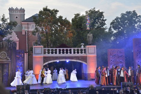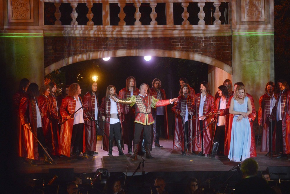 Provedení Rigoletta v areálu zámku Topasz nebylo v pravém slova smyslu premiérou, inscenace běží na mateřské kamenné scéně na Svídnické ulici. Dekorace byly samozřejmě upraveny a opera byla režijně i scénicky přizpůsobena možnostem nového prostředí. Během výjimečně teplého prvního zářijového víkendu byla odehrána celkem tři představení, a to pod taktovkou ředitelky Wroclavské opery dirigentky Ewy Michnik (studovala ve Vídni u Hanse Swarowského). Klasická režie známého a žádaného hostujícího Michała Znanieckého, který byl také autorem scény, byla přizpůsobena novému prostředí Adamem Frontczakem z wroclawské opery.