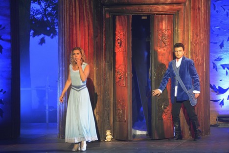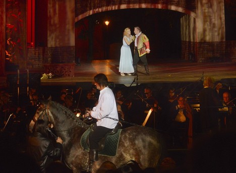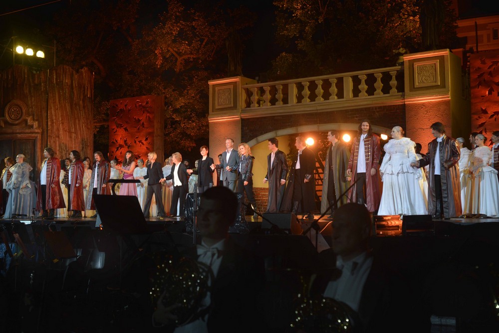 Po chvíli se opět ozývá hudba orchestru přenášená z krytého sálu do hledištních reproduktorů. Nastupují sólisté, nad kterými samozřejmě deštník nikdo nedrží a jede se dál. Zbytek tragicky končícího děje snad již není třeba připomínat. Při závěrečné děkovačce déšť skoro ustává a dlouhý aplaus publika je uznáním nejen za umělecké výkony všech účinkujících (přišel se poděkovat i celý orchestr), ale i za statečné příslovečné „zpívání v dešti“.+++