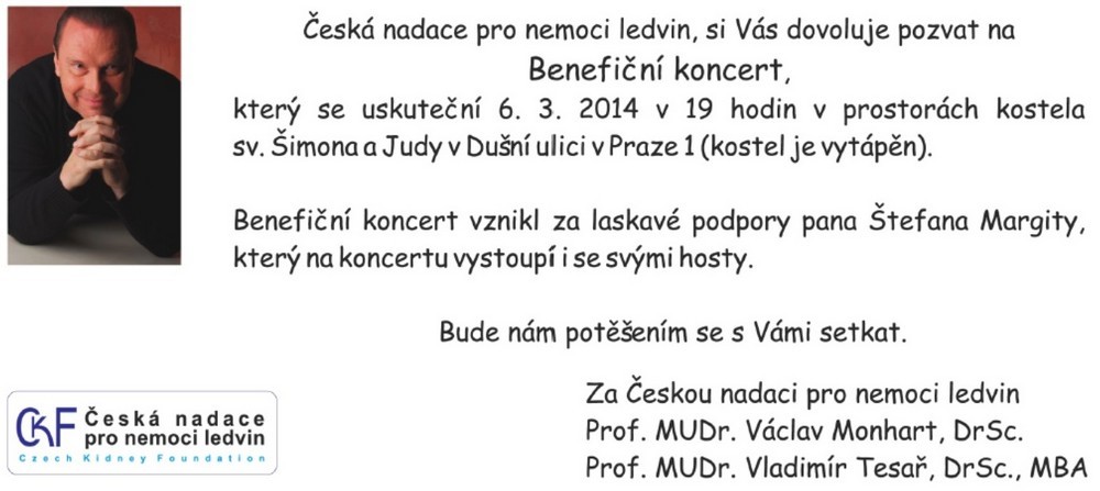 Už příští čtvrtek 6. března předá tenorista Štefan Margita společně se svými hosty, harfenistkou Kateřinou Englichovou, herečkou Hanou Maciuchovou a klavíristkou Katarínou Bachmannovou stotisícový šek České nadaci pro nemoci ledvin. Slavnostního benefičního koncertu u svatého Šimona a Judy v Praze se můžete zúčastnit i vy, a to za symbolické vstupné ve výši alespoň jedné koruny! Jen musíte přijít včas, zbývá nejvýše dvě stě volných míst. Začíná se přesně v sedm večer.