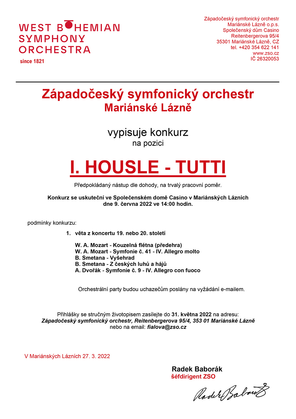 Čtení Západočeský symfonický orchestr Mariánské Lázně vypisuje konkurz na pozici I. housle – tutti