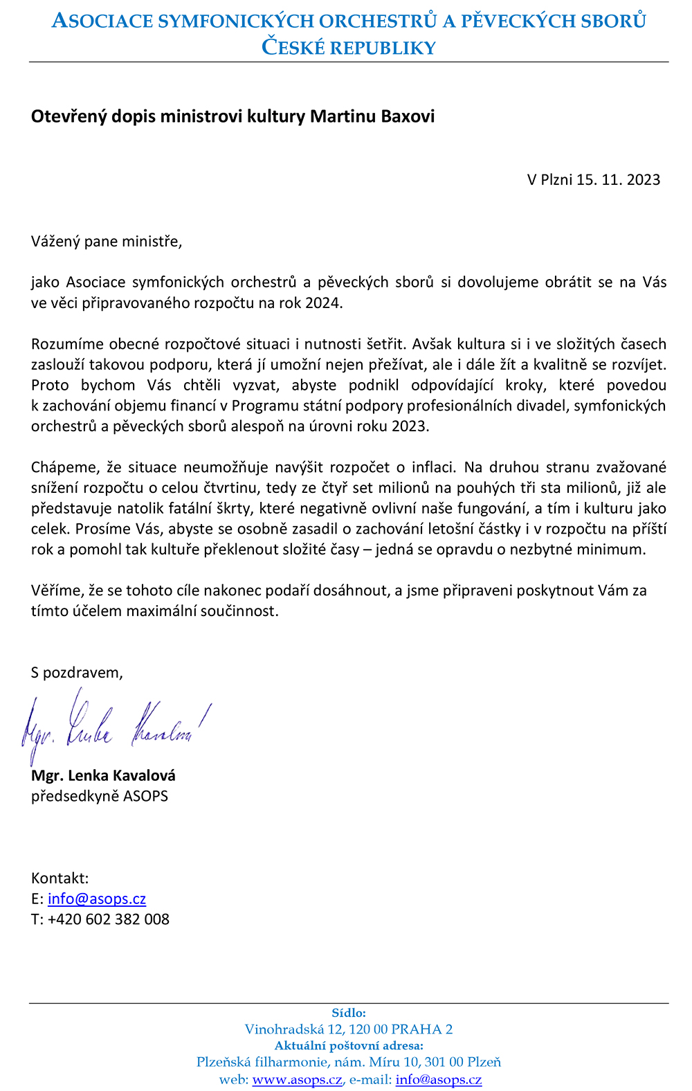 Zástupci Asociace, která sdružuje šestnáct významných hudebních těles z celé republiky, přijali na svém jednání usnesení (viz níže), s nímž se formou otevřeného dopisu obrací na ministra kultury Martina Baxu. Jejich cílem je, aby rozpočet Programu státní podpory profesionálních divadel, symfonických orchestrů a pěveckých sborů zůstal alespoň na úrovni letošního roku a nesnižoval se.