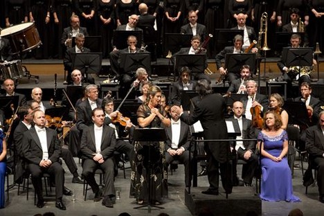 Hvězdný dirigent bohužel plní své předsevzetí z roku 2011, kdy se zavázal, že po předchozích špatných zkušenostech už nebude na Salcburském festivalu dirigovat žádnou režijně a scénicky připravenou operní inscenaci. Dekorace ke svému ještě v červnu reprízovanému Nabuccovi v režii Jeana Paula Scarpitty tedy nechali římští návštěvníci doma a rozhodli se prezentovat na festivalu pouze jeho hudební stránku.